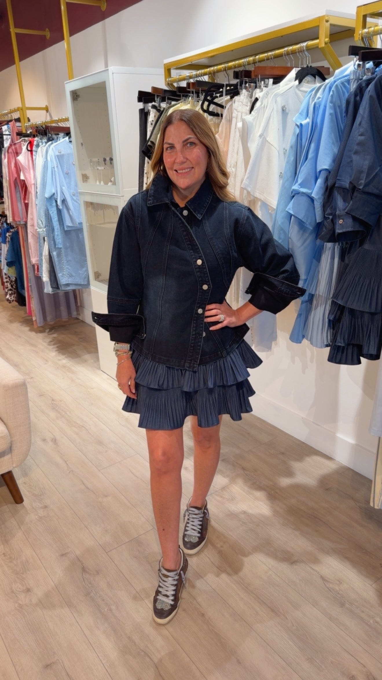 Effortlessly chic and modern, the Midnight Denim Jacket is a statement piece designed to elevate your everyday look. Crafted from premium denim, this structured jacket features a flattering tailored silhouette with elegant button closures and a unique pleated ruffle hem that adds a feminine and sophisticated touch.