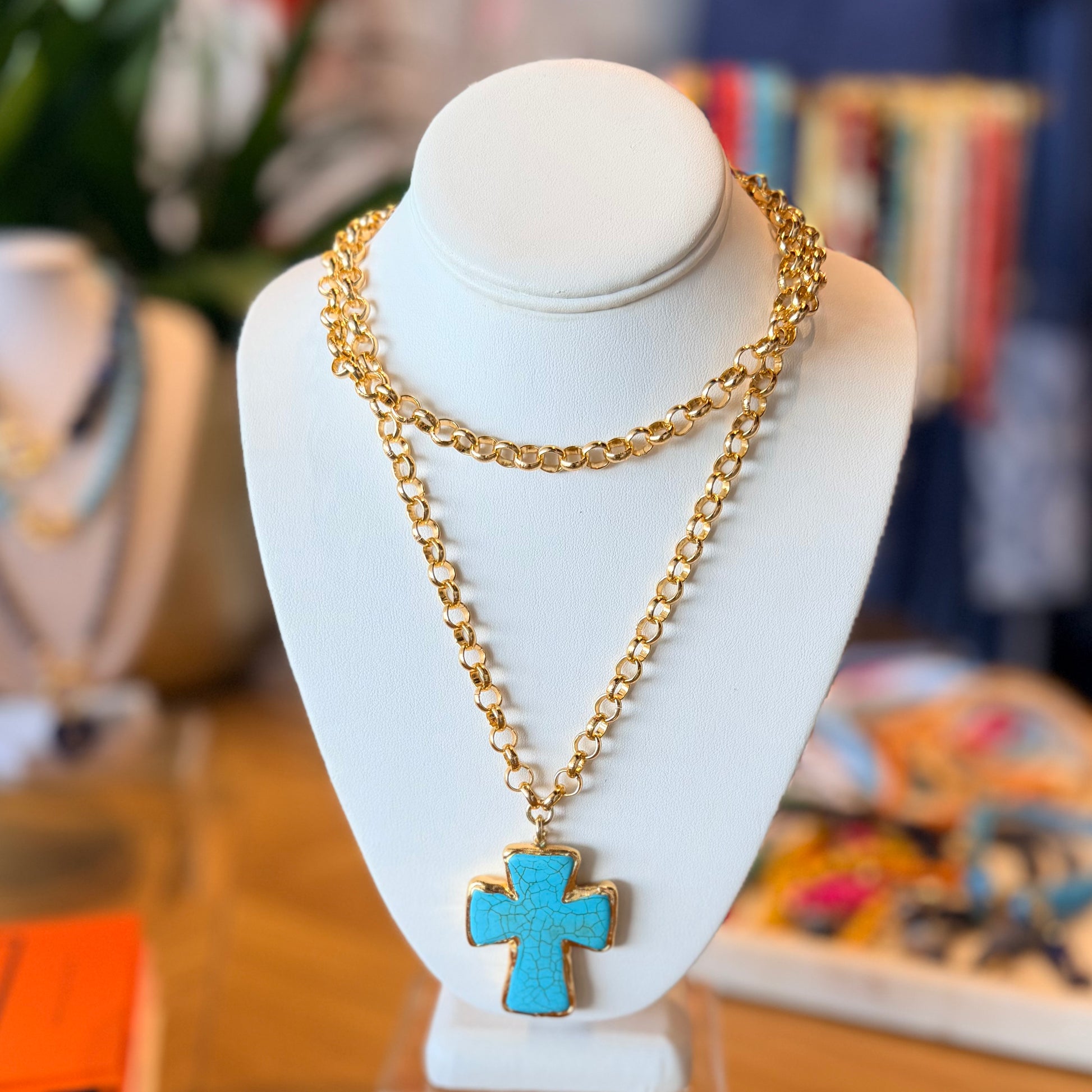 Collar largo de cruz azul engastado.
