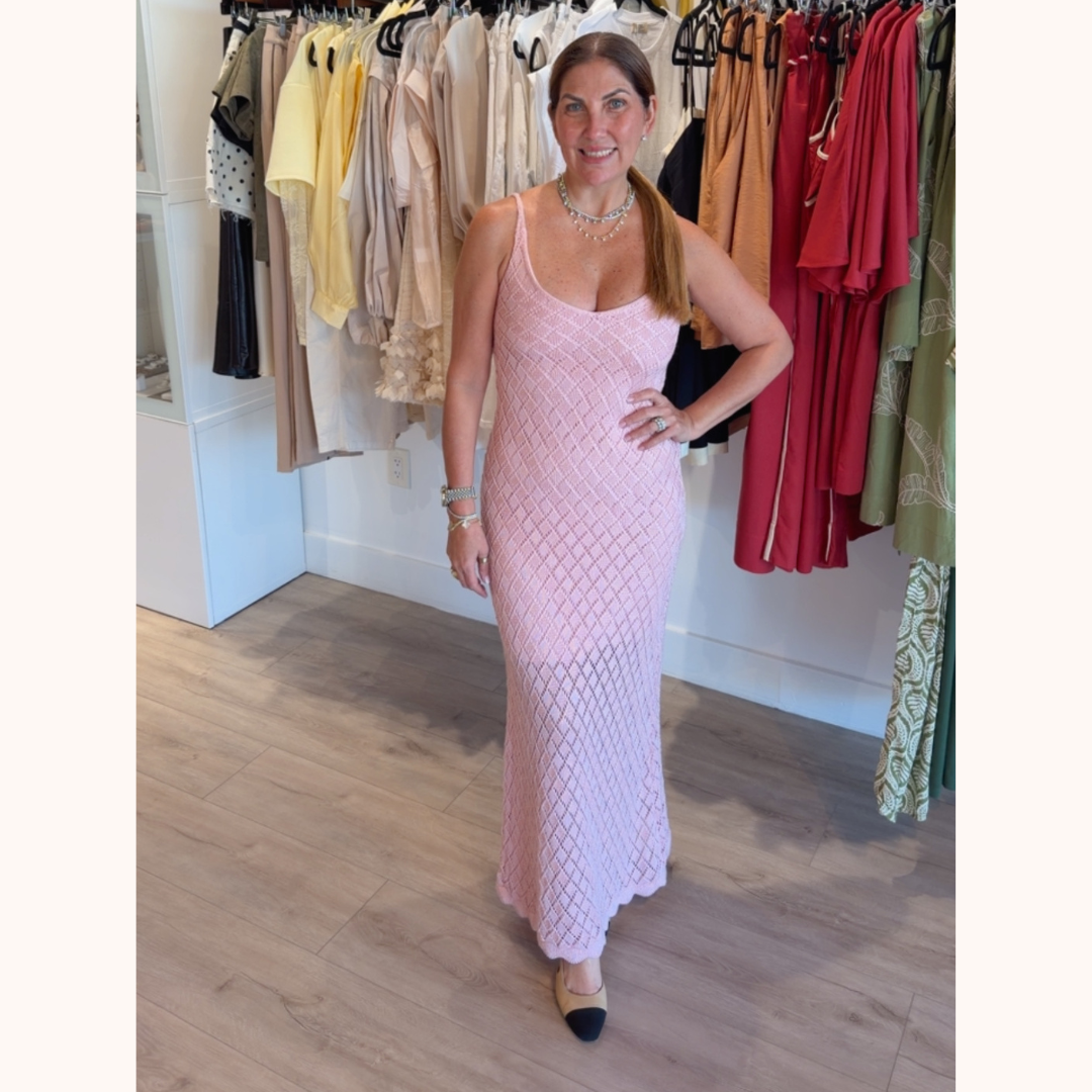 Soft, feminine, and effortlessly flattering, this knit maxi dress features a delicate textured pattern that adds subtle dimension and sophistication. Designed with slim straps and a figure-skimming silhouette, it creates a sleek and elongated look. Perfect for brunches, summer gatherings, or elevated everyday wear.