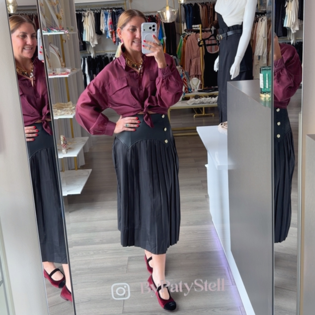 Falda de pliegues con cintura de cuero