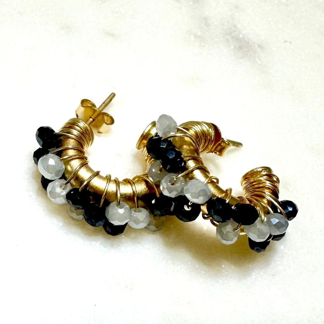 Mini argollas alambrada con cristales. Esta joya combina la artesanía detallada del alambre meticulosamente entrelazado con el brillo deslumbrante de los cristales.
